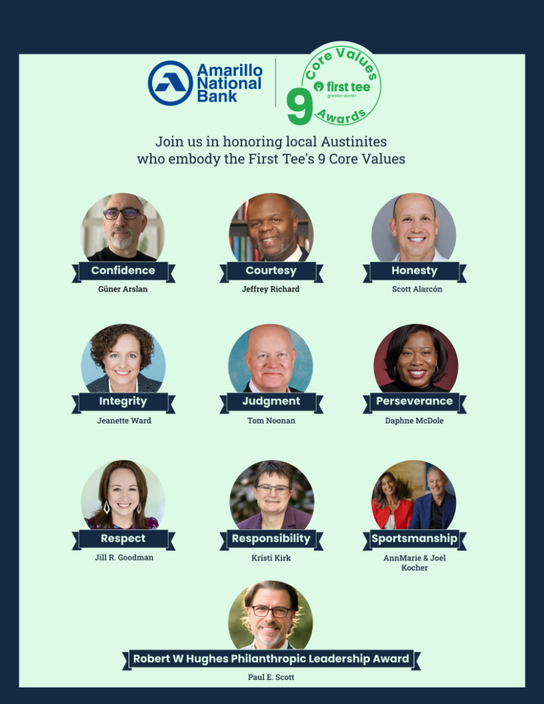 The 18th Annual Amarillo National Bank 9 Core Values Awards Luncheon will be at the Hyatt Regency Austin on Tuesday, February 17, 2026 from 11:30 am-1:30 pm, the event will recognize 10 people from the Austin community whose life works reflect the First Tee’s 9 Core Values. Additionally, the Robert W. Hughes Philanthropic Leadership Award recognized a 10th honoree for their leadership in the non-profit community. Each nominee is chosen via an independent selection committee.