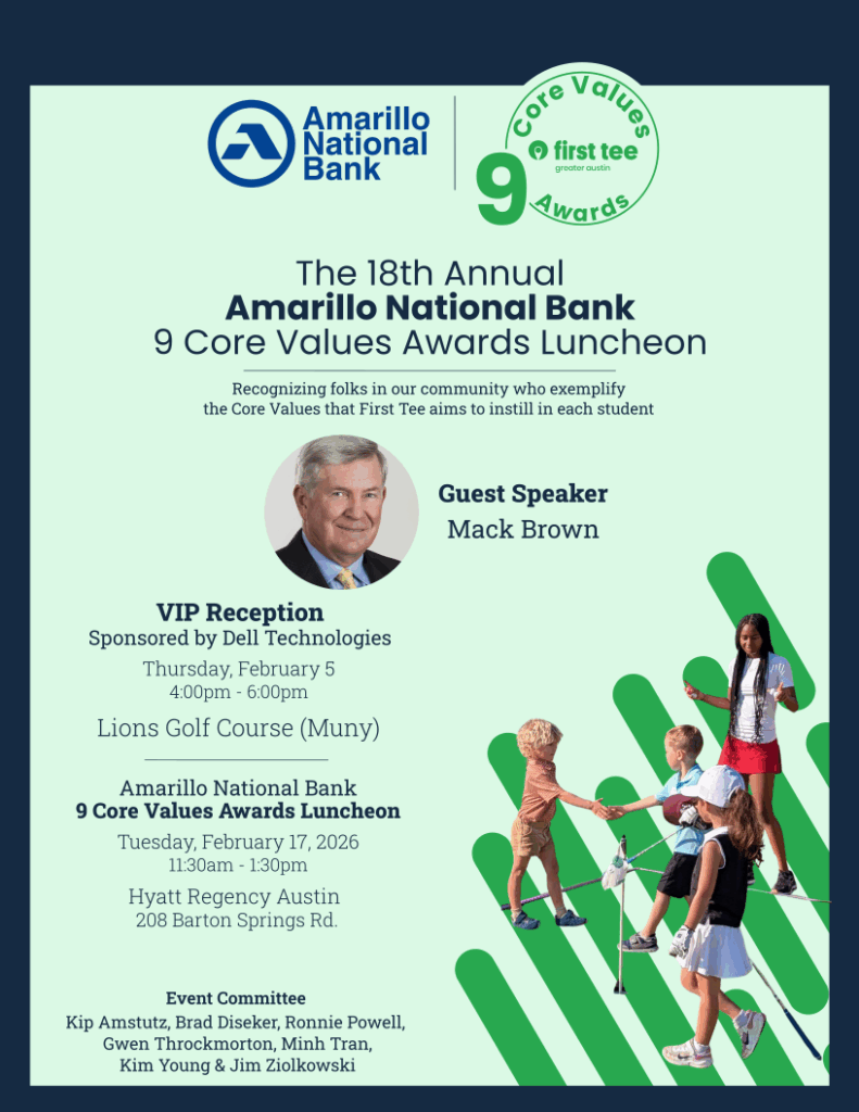 The 18th Annual Amarillo National Bank 9 Core Values Awards Luncheon will be at the Hyatt Regency Austin on Tuesday, February 17, 2026 from 11:30 am-1:30 pm, the event will recognize 10 people from the Austin community whose life works reflect the First Tee’s 9 Core Values. Additionally, the Robert W. Hughes Philanthropic Leadership Award recognized a 10th honoree for their leadership in the non-profit community. Each nominee is chosen via an independent selection committee.
